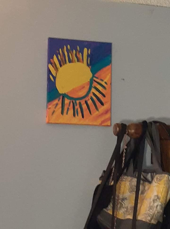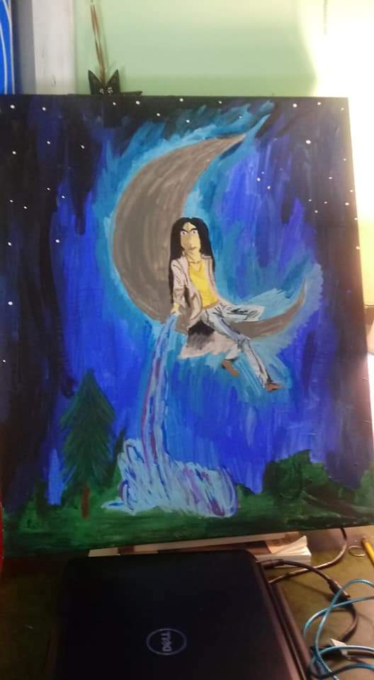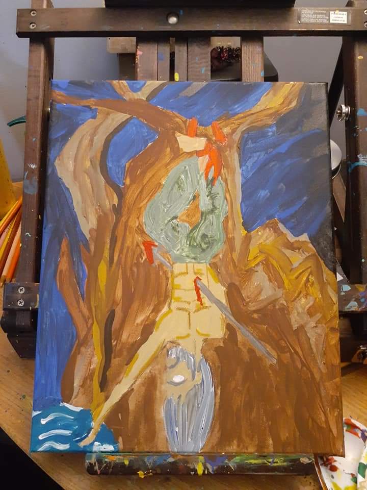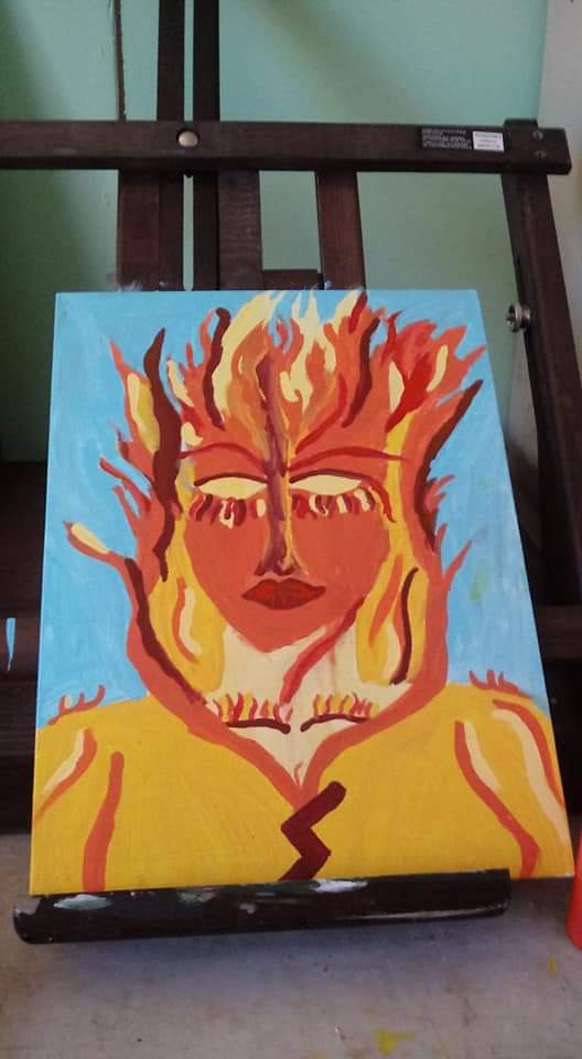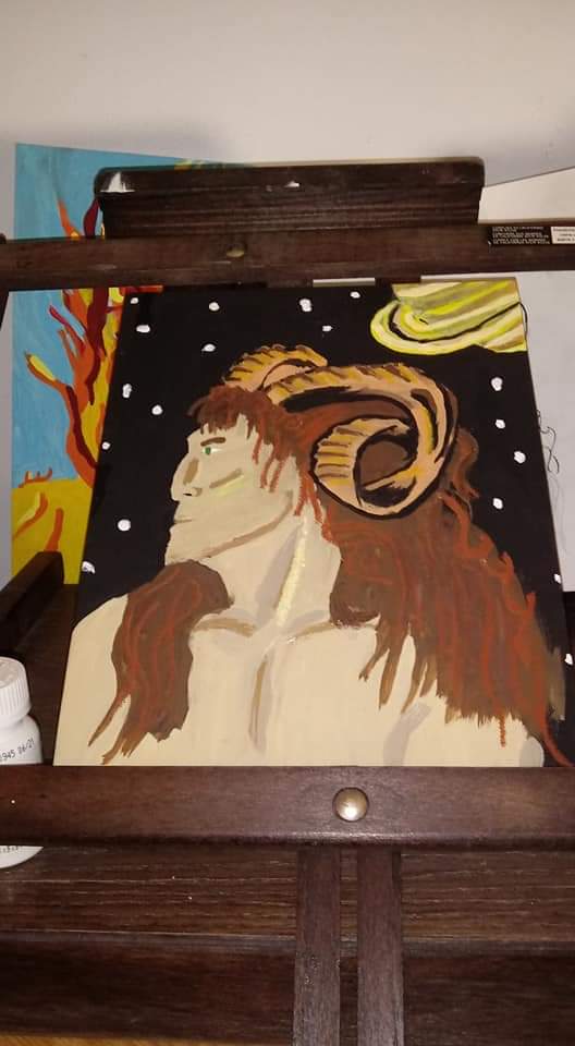 Mani, the Norse God of the moon. Mostly acrylic paint, some details with oil pastels. I’m mostly pretty happy with how this one turned out. I need to practice hands in general and I’m not 100 percent happy with the waterfall from his hand, but overall I’m very proud of this one. Sunna, the Sun Goddess“Under the Rings of Saturn” this was a Yule gift last year, for a (Capricorn) friend who worships Pan
